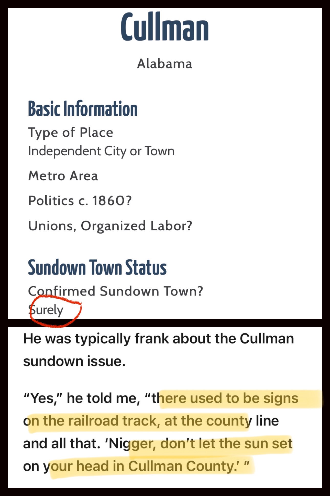 In Wikipedia regarding the town of Cullman Alabama the threat is mentioned. Cullman County sheriffs department via their Facebook page. Sundown Towns Cullman and Marshall Counties.